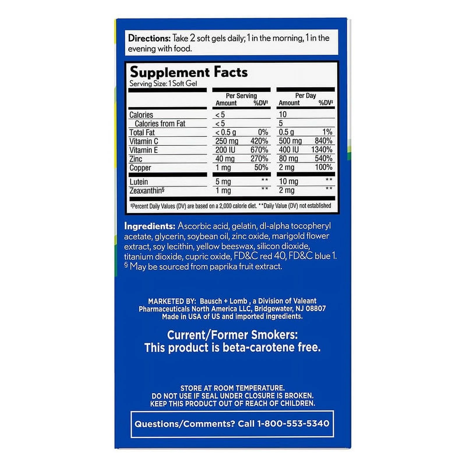 Ascorbic Acid, Gelatin, Dl-Alpha Tocopheryl Acetate, Glycerin, Soybean Oil with Peanut Oil, Zinc Oxide, Marigold Flower Extract, Soy Lecithin with Peanut Oil, Yellow Beeswax, Silicon Dioxide, Titanium Dioxide, Cupric Oxide, FD&C Red 40, FD&C Blue 1