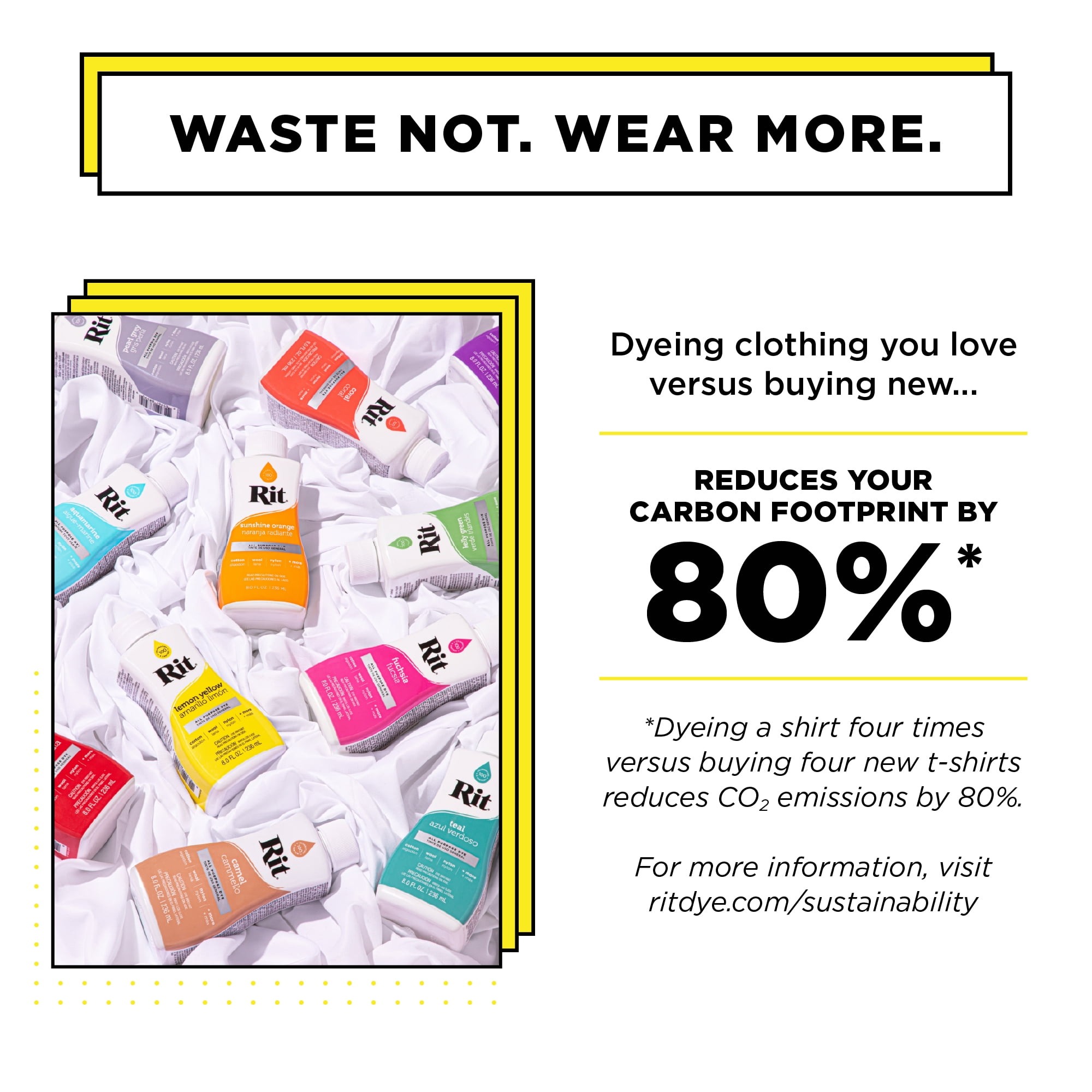 This versatile, easy-to-use and non-toxic Rit Black Liquid Dye is ready to deliver vibrant color to almost any type of fabric or fabric blend. Perfect for rejuvenating faded clothing, changing the color of apparel, shoes or accessories, coordinating home décor, hiding laundry accidents and so much more. Follow one of Rit’s easy-to-use tutorials on how to create a tie-dye, ombré, dip dyed, marbled or shibori pattern. Or see for yourself how beautifully Rit dyes wood, wicker, paper and cork. Whatever your purpose, all you need is a washing machine, plastic container or stainless steel sink to get started. Perfect for cotton, linen, silk, wool, ramie, rayon, viscose, nylon, modal, tulle, wood, paper, cork and hemp. Saving four shirts you love with our non-toxic dye versus buying new ones reduces your CO2 emissions by 74%. CO2 is the main contributor to climate change.