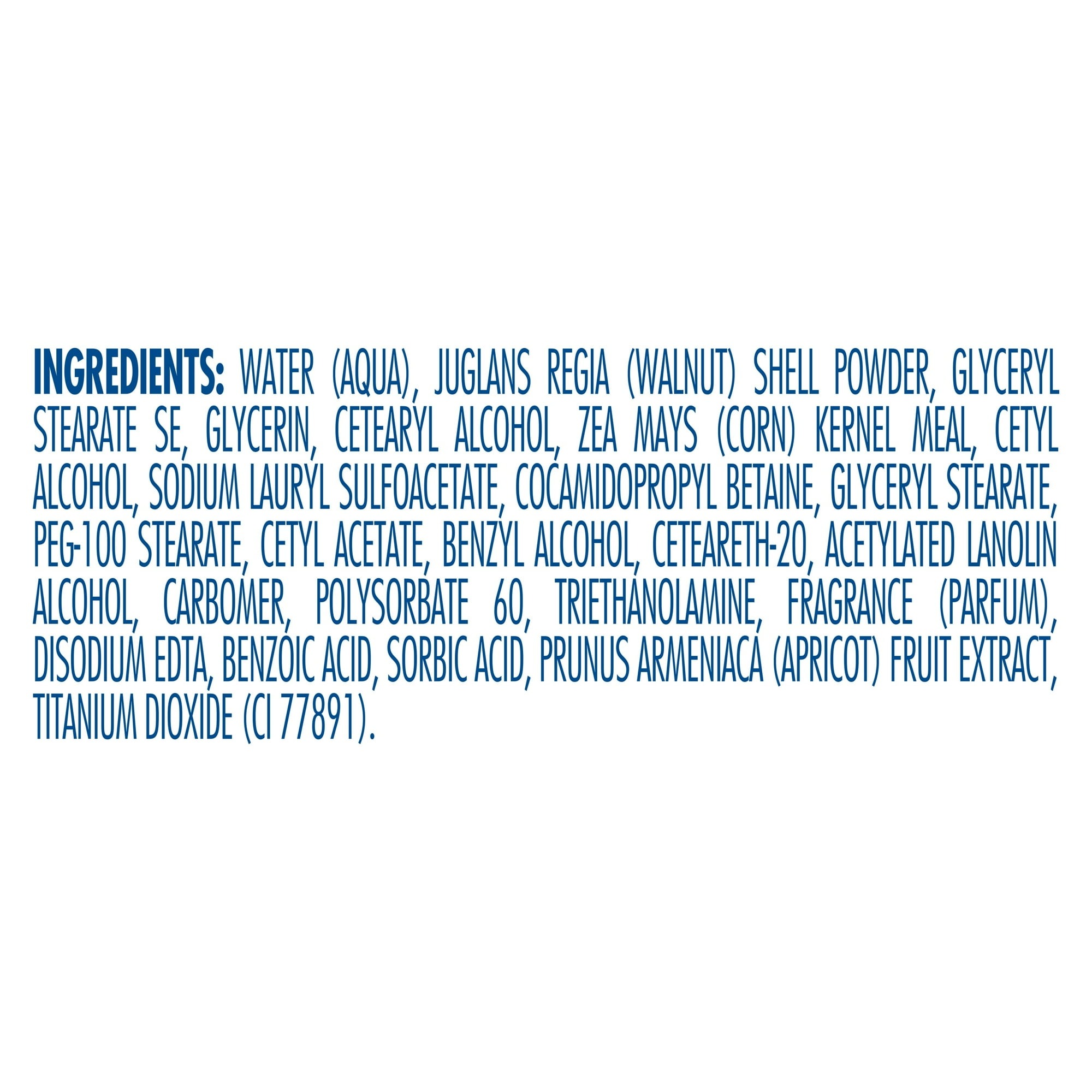 Water (Aqua), Juglans Regia (Walnut), Shell Powder, Glyceryl Stearate SE, Glycerin, Cetearyl Alcohol, Zea Mays (Corn), Kernel Meal, Cetyl Alcohol, Sodium Lauryl Sulfoacetate, Cocamidopropyl Bataine, Glyceryl Stearate, PEG-100 Stearate, Cetyl Acetate, Benzyl Alcohol, Ceteareth-20, Acetylated Lanolin Alcohol, Carbomer, Polysorbate 60, Triethhanolamine, Fragrance, Disodium EDTA, Benzoic Acid, Sorbic Acid, Prunus Armeniaca (Apricot) Fruit Extract, Titanium Dioxide (CI 77891)