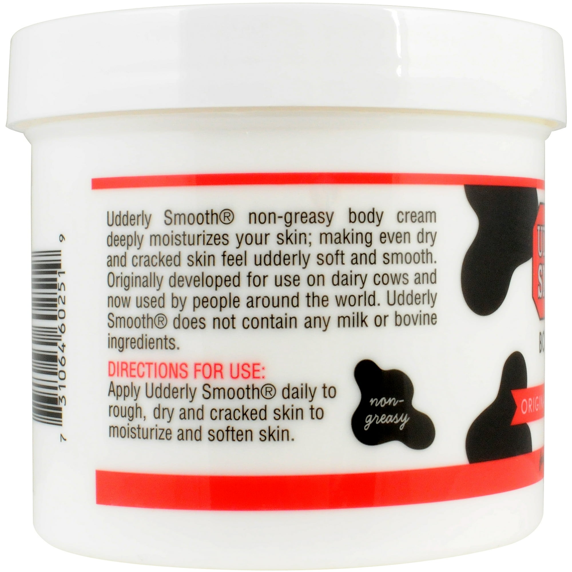 - UDDERLY SMOOTH BODY CREAM in the original, non-greasy, lightly scented moisturizing formula for use on hands, feet, knees, elbows & face to help moisturize, hydrate, replenish & care for your skin so instead of being chapped & dry, it feels udderly smooth.