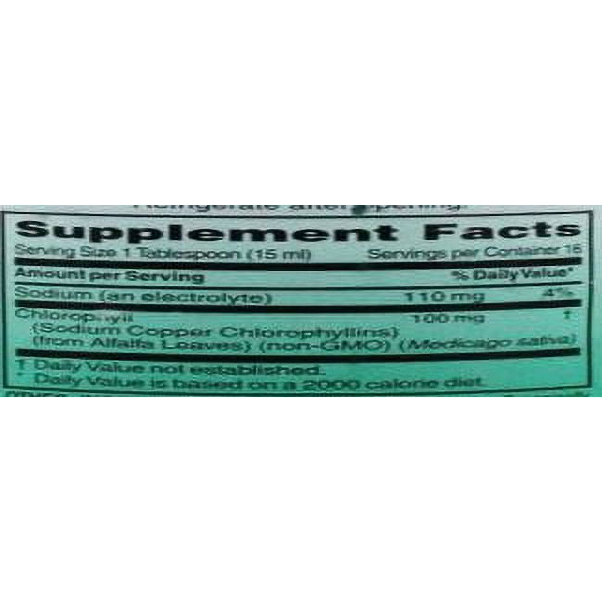 World Organic – Liquid Chlorophyll 100 mg. – 8 oz. (237 ml) Supplement Facts Serving Size: 1 Tablespoon (15 ml) Servings Per Container: 16 Amount Per Serving % Daily Value* Sodium (an electrolyte) 110 mg 4% Chlorophyll 100 mg †(Sodium Copper Chlorophyllins) (from Alfalfa Leaves) (Medicago sativa) †Daily Value not established.* Daily Value is based on a 2000 diet. Other Ingredients: Isotonic Water Solution, Organically Grown Alfalfa Leaves in kosher vegetable glycerin (medicago sativa). Preservative Free